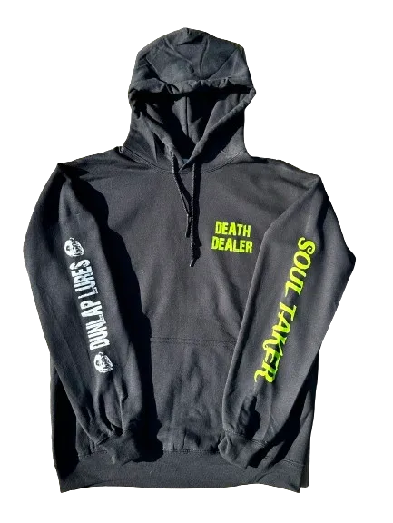 Gildan Heavy Blend Hoodie with "Death Dealer" and "Soul Taker" in lime green color. Back has Dunlap Lures/Results Matter white logo on back.