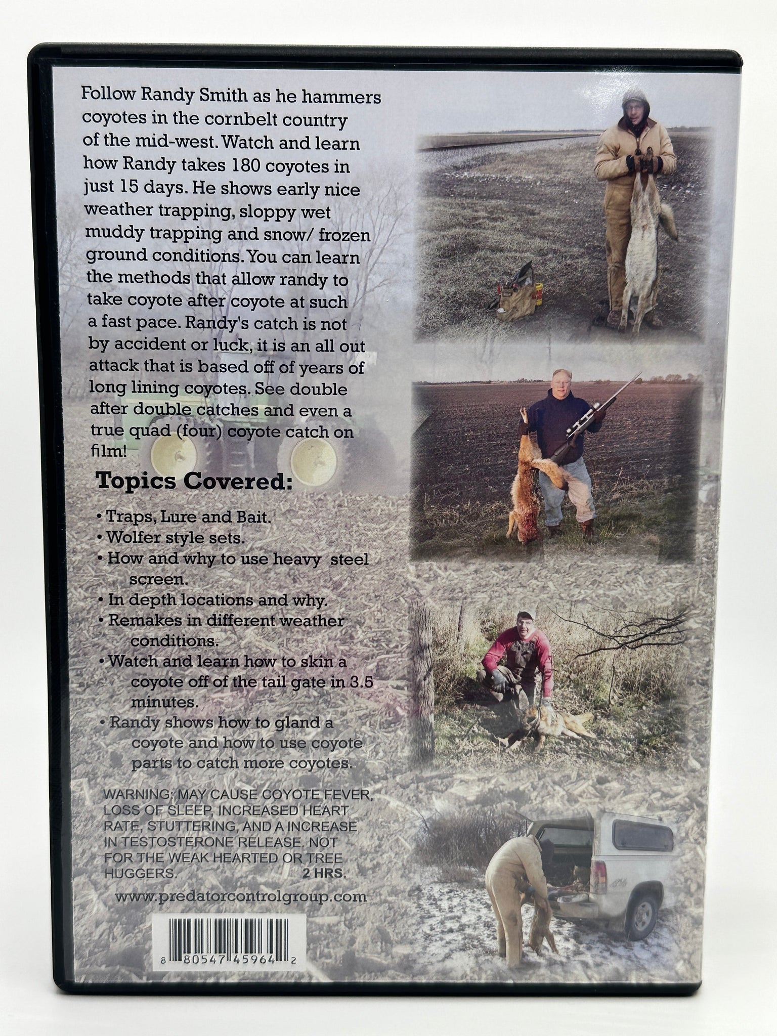 Follow Randy Smith as he hammers coyotes in the corn belt country of the mid-west. Watch and learn how Randy takes 180 coyotes in just 15 days. He shows early nice weather trapping, sloppy wet muddy trapping and snow/ frozen ground conditions. You can learn the methods that allow Randy to take coyote after coyote at such a fast pace. Randy's catch is not by accident or luck, it is an all out attack that is based off of years of long lining coyotes. See double after double catches and even a true quad (four) coyote catch on film! Topics Covered: Traps, Lure and Bait and wolfer style sets.  How and why to use heavy steel screen. In depth locations and why. Remakes in different weather conditions. Watch and learn how to skin a coyote off of the tail gate in 3.5 minutes. Randy shows how to gland a coyote and how to use coyote parts to catch more coyotes.